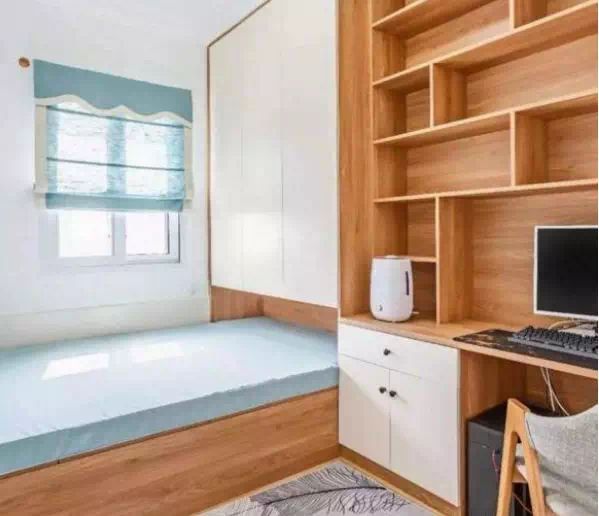 在榻榻米书房,靠窗的方位,左面是一个衣柜,右边是书桌与书橱的组合。榻榻米床+衣柜+书桌结合在一起的设计方式,既能提供大量的储物空间,又能创造个性与休闲的家居氛围,美观实用两不误!