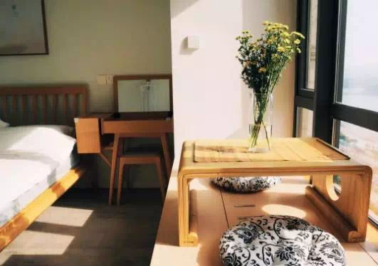 在卧室里的飘窗位,运用榻榻米+矮茶几,配上软垫,就成为了小两口的欢乐之地。