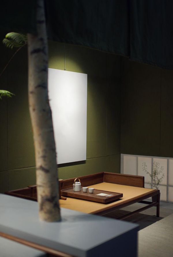 此次素元营造了一隅更侧重氛围的空间,而不是主观的、强势的去推出产品。我们希望来看展的人不仅仅只是愉悦自己的眼睛,而是可以用身体进入这个氛围,带来一些生活上的启发。整个设计结构的灵感来源于中国古时空间营造时的“幄”——由于四面围合起来象屋宇而得名,“巾”与“屋”联合起来表示布巾围成的私密空间,这也是为什么在材料上我们选择了更有温度感的、哑光的布料。这样进入环境后的人,心会慢慢沉下来,安住舒服。