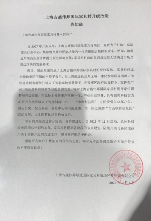 9月6日,上海吉盛伟邦国际家具村下发升级改造告知函,告知其项目被绿地集团收购,项目将面临升级改造和商户拆迁。