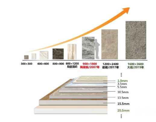 仅两年后的2016年,蒙娜丽莎集团就率先推出2400×1200mm陶瓷大板,并提出大岩板方向,推出13.5mm厚岩板产品。属于中国人的“超石代”,自此开启。