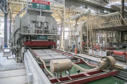 这种大规格岩板由蒙娜丽莎与恒力泰合力研发的首台HT36000压机压制生产。这是中国人自己研发设计生产的大吨位压机,完完全全的“国货”。