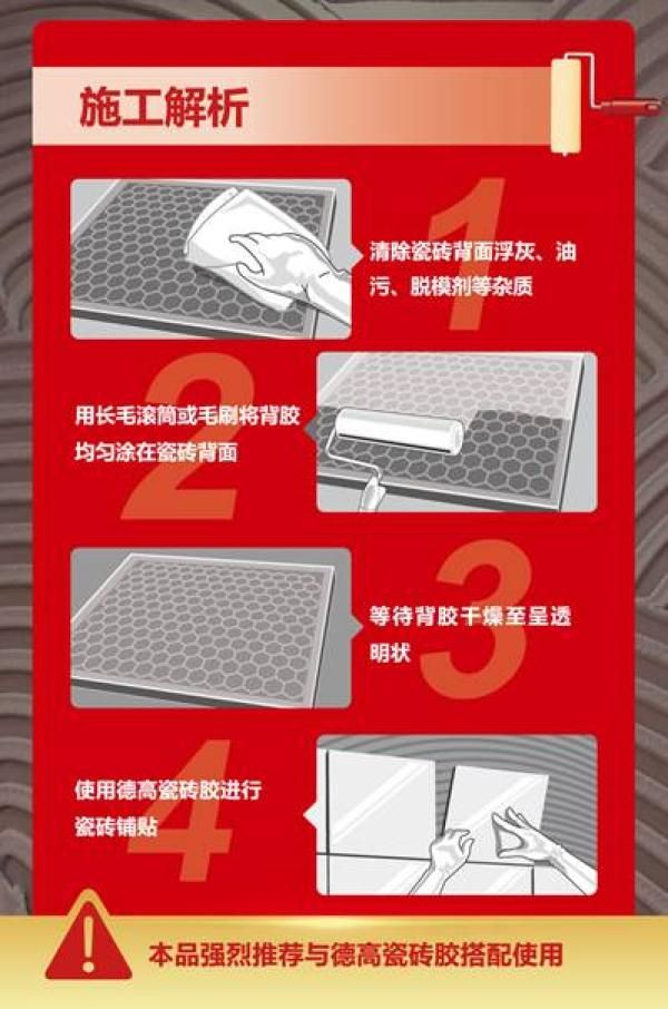 其施工步骤也简单易行,三步轻松搞定。第一步,清除瓷砖背部浮灰、油污、脱膜粉等杂质;第二步,用长毛滚筒或毛刷将背胶均匀涂在瓷砖背面,注意涂刷背胶必须是满涂,然后等待胶干燥至透明状;第三步,使用德高瓷砖胶进行瓷砖铺贴。
