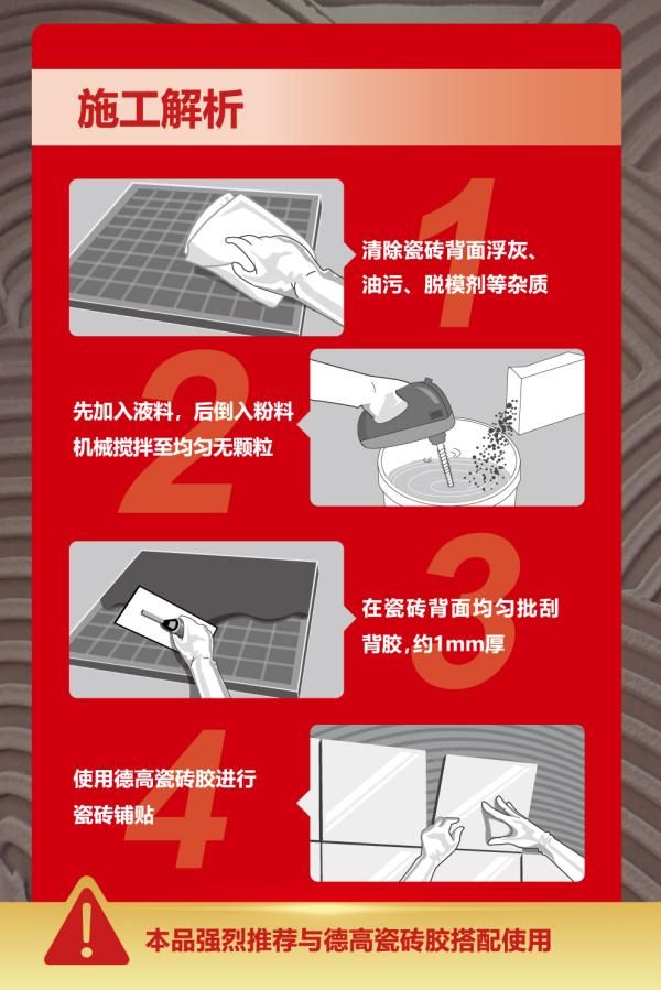 介绍完德高单组分背胶的施工步骤,接下来就讲讲双组份背胶——德高玻化砖背胶的施工步骤。它一共有四个步骤: