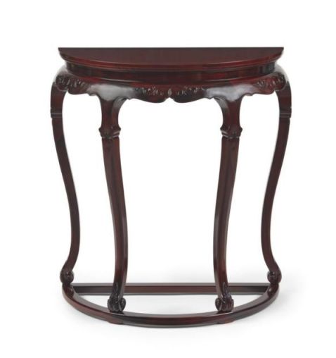 此月牙桌大红酸枝制成,桌面呈半月形,攒框镶板,高束腰,牙板饰卷草纹,蜻蜓腿,外翻卷叶纹足。形制巧妙,可靠墙或临窗,上置花瓶、古董等陈设,赏心悦目。