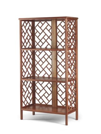 此书架四面平式,分三层,正面开敞,三面镶棂格,有通透空灵之美。全架格以铁梨木制成,唯背面正中连贯上下的板条为楠木,楠木本色突破了铁梨木暗灰褐色的沉闷,实用而又美观,极具现代设计感。