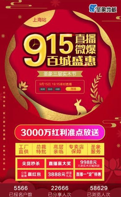 圣象915国际实木节的活动前期,利用朋友圈分享传播信息,联动百城,同时期引爆造势,充分挖掘每一个用户的私域流量,无论对于短期的直播聚客,还是长期的品牌口碑积淀,都不失为一个不错的选择。“工厂直供”、“3000万红利准点放送”、“足不出户尊享好礼”等字眼将活动力度和便捷的活动方式展现出来,瞄准用户消费心理,再加上圣象多年的品牌积淀,消费者十分乐于分享这种品质大牌的促销活动,也热衷于拉上有需求的亲朋好友一起买买买,社交营销疯狂实现裂变式传播。