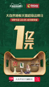 9月15日,大自然地板联手天猫,打造以“自然生活别硬装”为主题的天猫超级品牌日,为消费者带来专属大自然地板的双11狂欢。这次大自然地板X天猫超级品牌日,整合线上线下创意营销活动, 从营造全网声势到线下产品体验,为消费者带来家居消费新体验。据悉,本次活动,是大自然地板首次与天猫超级品牌日合作,活动当天,全渠道爆卖超1亿元,大自然天猫官方旗舰店实木地板销量较8月日均增长2566%,实现天猫平台当日地板品类销售第一。
