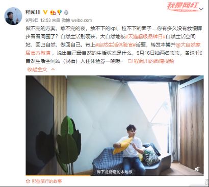 据了解,为了让更多消费者亲临零碳星球体验自然生活,大自然家居官方微博发起了自然生活体验官的招募。短短几天时间内,单单微博话题就达到77万+人次的参与,总话题触达量超百万。而旅行达人“程阅川”则是第一个体验官。体验之后,程阅川更在微博主动发布其对自然生活空间站的体验视频,并在粉丝中邀请2位用户参与体验。