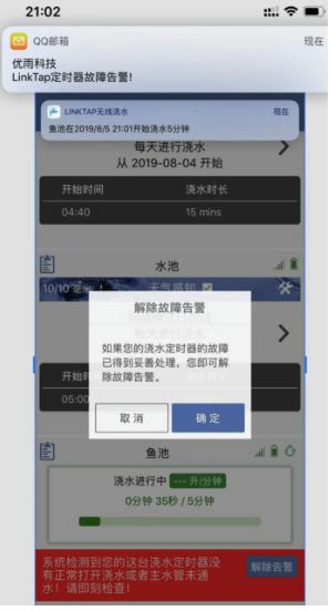 上述任一异常发生时,通过第二代产品,用户会在30秒内收到手机推送消息及邮件。邮件不光会发送给用户,还可以发送给用户指定的另外两位接收人(比如邻居或亲朋好友),以便于用户可以更迅速地处理异常情况。中国地区用户通过 “LINKTAP智能灌溉”公众号绑定控制器,可同时在微信上收到通知信息。
