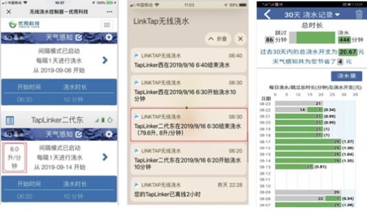 通过G2,用户可以在手机上看到浇水时的实时流速。并且在每次浇水结束后得知此次浇水用了多少升的水,花了多少水费。用户还可以在浇水历史纪录里查看过去90天内,每天以及总共用了多少升的水,花了多少水费。