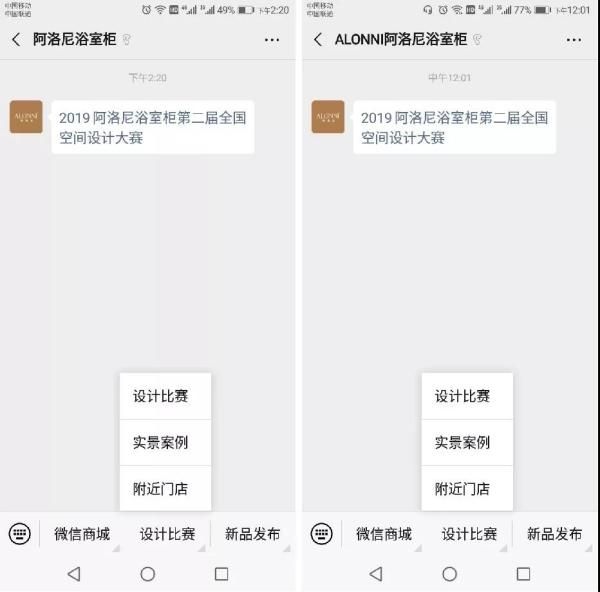 除此之外,小伙伴们可以关注阿洛尼浴室柜微信公众号“ALONNI阿洛尼浴室柜”或者“阿洛尼浴室柜”。在任一微信公众号底部菜单,选择“设计大赛”栏目进入投票。
