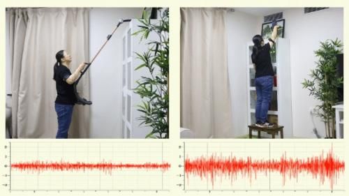 在高处清洁测试中,2个吸尘器的使用形态有较大区别,无线吸尘器需要举起整个主机。而立式/手持吸尘器通过软管和长接管的链接,仅需举起长接管就可以清理高处,无论肉眼观察用户的使用姿态,还是数据观测肌电波形图,我们都可以明显看出,立式/手持吸尘器用起来更轻松。