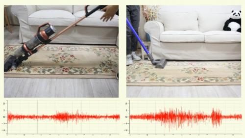 在地面清洁模拟测试中,使用立式/手持吸尘器的用户,肌电图波动变化不大,而使用手持吸尘器的用户在清洁地毯时,肌肉图波动突然明显剧烈增加,这说明用户需要用更大的力气才能在地毯上推动手持吸尘器。