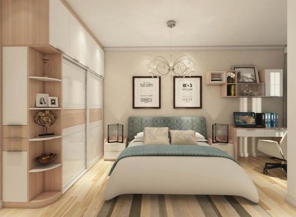 开启电视墙旁边白色的木门,进入了宽敞明亮的主卧。进门一扇大衣柜,有足够的空间满足主人储存衣物。一张舒适柔软的大床,搭配了与客厅沙发的同属色系,烘托出一丝轻快调皮的感觉。