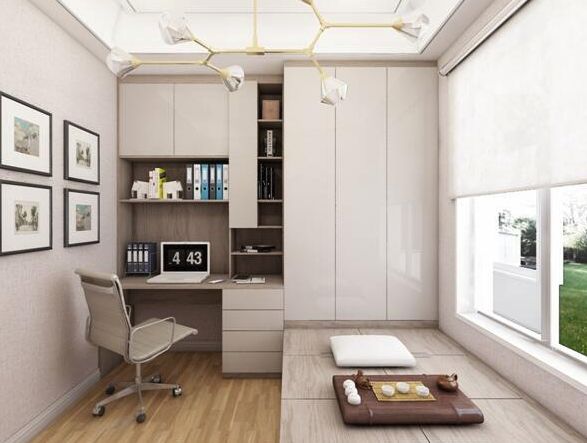 集书房,茶室,休闲为一体的多功能房,让小空间发挥出大作用。储物式单人榻榻米满足平日会客饮茶,有需求时铺上床上用品便化身为一间卧室。整面墙柜设计带着书桌,隔板阻挡物品坠落。明亮色彩搭配,便于日常的休闲、工作。