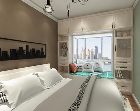 次卧相较于主卧空间小了许多,这时,飘窗就显示出实用性了。可以利用飘窗将收纳与休闲完美的融合在一起,不仅仅作为一个装饰的小角落,也能化身储物小能手,让收纳变得科学合理。而一个小小的绿色系飘窗毯,避免了整个卧室过多黑白灰所表现的单调。