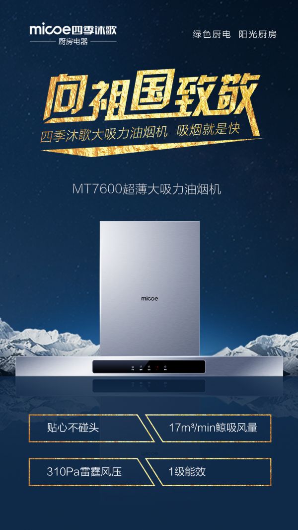 “向祖国致敬”,可以看做是四季沐歌厨房电器对旗下产品的一次全面巡礼,也可以看作是四季沐歌厨电为其所聚焦的县乡市场的消费者所制定的国庆悦宾盛宴,正是秋季家装和新婚人群选购厨电产品的好时机。