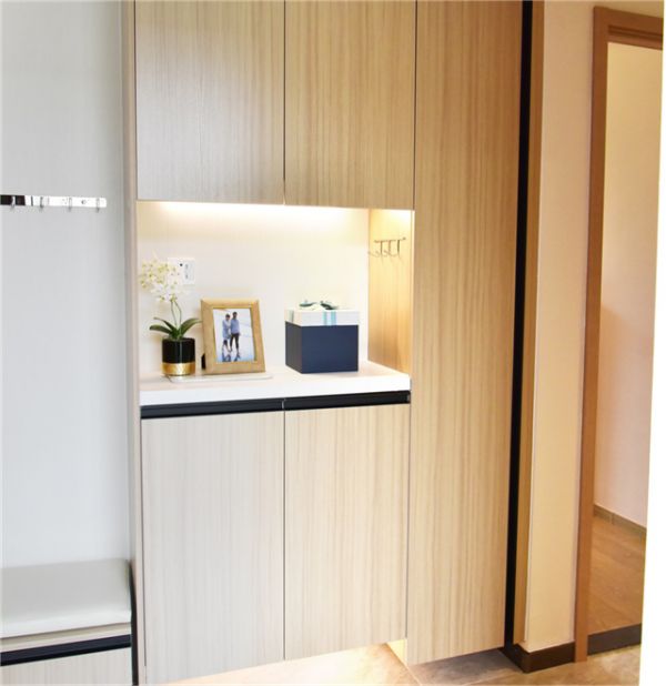 原木风的舒适自然,无疑给人带来了整洁清新的第一印象。此外,玄关柜设计还能起到物品收纳的效果。普通的玄关柜只能满足鞋柜的日常功能,案例中量身定制的领尚玄关一体柜,则不仅有地柜,还做了吊柜,以及特别设置的小立柜。合理的收纳让玄关处十分简洁,一个完美的玄关无疑是颜值和收纳并存的。