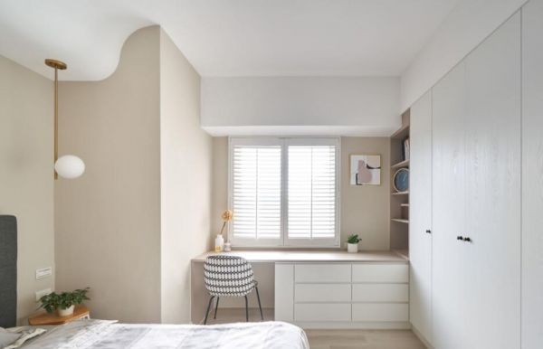 另外一边半开放式的厨房与多功能室以玻璃推拉门做轻隔间,原本采光及通风不良问题也迎刃而解。厨房更延伸玄关的西班牙花砖地坪,让场域之间得以串联。主卧内,设计师以弧型修饰床头大梁,化解风水煞气,再加上造型吊灯为简约的空间增添个性,整面的衣橱则满足收纳需求。