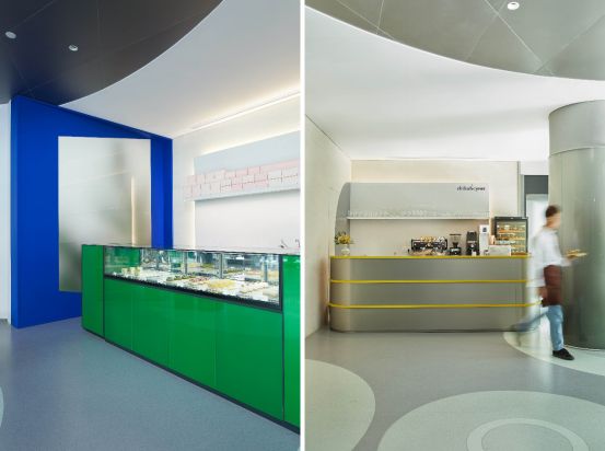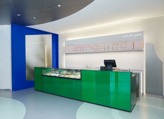 We are more aggressive on the color selection, for example, the proportion of the blue and green are almost same in the space. Meanwhile, we have made a contrast of the material with two colors completely; one a super-reflective degree finish, the other a matte material. Consequently, the spaces naturally take form an advancing and retreating layer.
