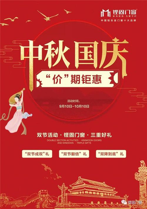 作为门窗十大品牌,铿固门窗于9月10日至10月10日期间,推出“中秋国庆,价期钜惠”的主题活动,三重优惠来袭,感恩回馈消费者。
