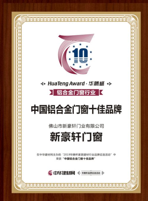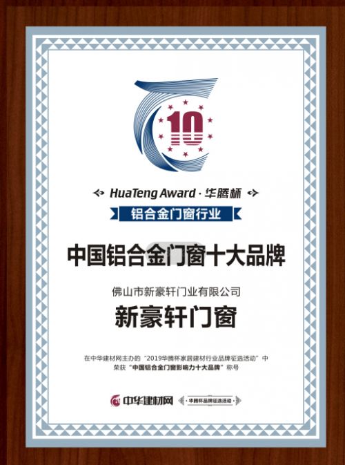 在刚刚结束的2019华腾杯“中国铝合金门窗十佳品牌、中国铝合金门窗十大品牌”网络评选活动中,新豪轩门窗凭借强大的品牌实力以及良好的市场口碑,一路过五关斩六将,成功赢得了“2019中国铝合金门窗十佳品牌 ”“2019中国铝合金门窗影响力十大品牌”双重荣誉。