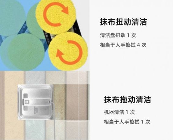 扭擦是圆形机的清洁方式,擦一次玻璃相当于人工清洁4次,效果最好。