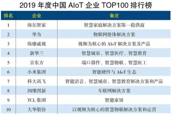 2019中国AIoT企业海尔智家、华为、海康威视位列前三