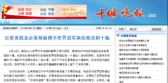施拉格在参加必美地板举行的挑战世界冠军活动的同时,也把快乐和精彩与十堰的乒乓球爱好者们一起分享。当天下午在红星美凯龙十堰商场,观众球兴大发,多名球迷与施拉格接连过招,现场气氛十分热烈,施拉格轻松应对,各种花式发球引得观众纷纷点赞,他的风趣幽默给观众留下了深刻印象,《十堰晚报》也报道了施拉格亮相十堰的新闻。