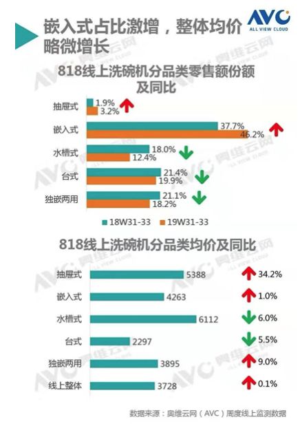 从线上洗碗机分品类零售数据看:嵌入式洗碗机占比最高,达到37.7%,同比去年大幅度增长34%,可以说是洗碗机的主流品类,这是很多家庭普遍适用的;从增长下降趋势看,抽屉式洗碗机方兴未艾,从去年的1.9%增至3.2%,可见抽屉式设计也是一个值得注意的趋势。除此之外,其他的品类都呈现下降的趋势,水槽式、台式和台嵌两用的品类均呈现大幅下降趋势,所以大家选择的时候一定要考虑清楚。