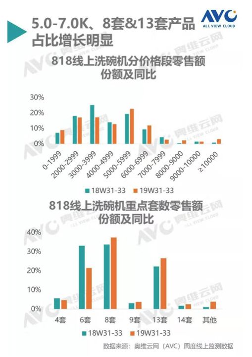 其次,从洗碗机的容量来看,6套、8套和13套的容量产品均是占比30%到40%左右,可以说是消费者主要选择的容量,其中8套和13套产品的占比增长率最为明显,可见很多人口较多的大家庭均是在入手洗碗机产品了,大家庭的洗碗工作是比较繁重的,这也与中国家庭的实际情况相符合。