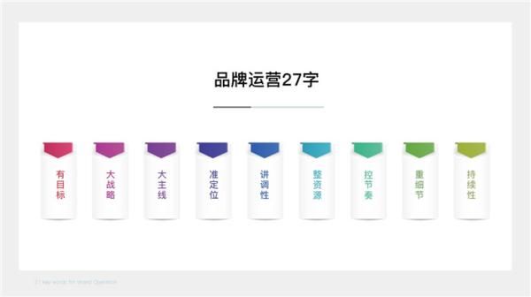 具体实操部分,这里有一个27字品牌诀:大战略,大主线,准定位;重初心、讲调性,整资源;控节奏,重细节,持续性。对于创业公司来说,可能还要加一个:深挖故事,重视公关。