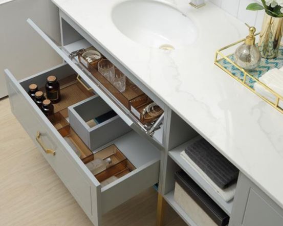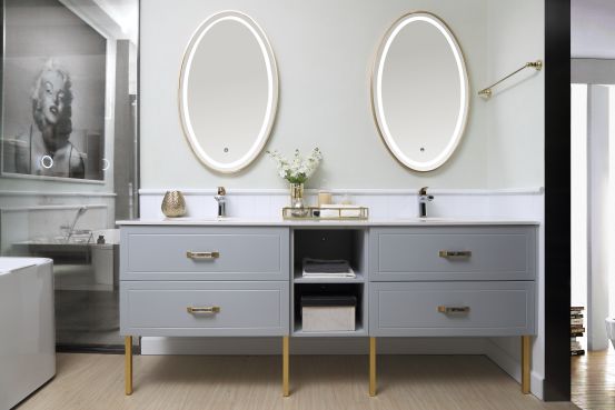 除了精湛的工艺和高品质的用材,箭牌浴室柜香榭系列的设计也透露着非凡格调,椭圆形的梳妆镜与长方形的浴室柜衬托出古典欧风的高贵,梳妆镜具有智能LED灯和防雾功能,让日常梳妆更加清晰方便,而浴室柜抽屉设计为U字型,既充分利用了盥洗盆下的空间,又方便日常用品的收纳分类。箭牌浴室柜香榭系列深入灵魂的高级感,是设计感与人性化的融合,是以人为本的体现。