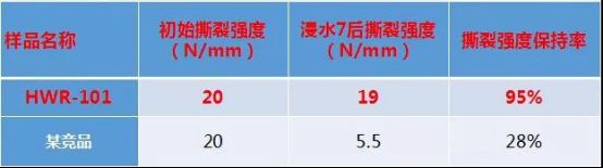 初始撕裂强度相同条件下,浸水相同时间,雨虹HWR101高耐水超柔防水涂料撕裂强度及其保持率均高于竞品。