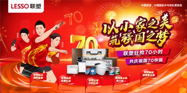 以小家之美,筑强国之梦。作为国内大型建材家居产业集团,中国联塑带着情意与匠心,用心做好产品和服务为社会创造价值。10月1日-10月7日期间,中国联塑以“以小家之美,筑强国之梦”为主题举行狂抢70小时促销活动,共庆祖国70华诞,旗下的卫浴、橱柜、净水机、防水、电线多品类产品集中聚惠,全屋产品大放“价”,让国人花更少的钱就能买到好产品。