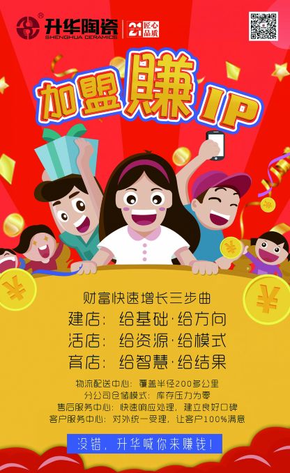 同时,升华陶瓷让国潮风尚与店面营销融合,传统与新潮花样结合,为传统的加盟销售赋予了新的潮流理念及含义,助你无忧创店成长,营销升华。