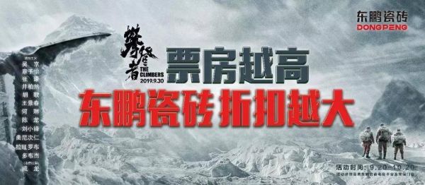 作为电影《攀登者》在瓷砖卫浴行业的官方独家合作伙伴,东鹏瓷砖将在9月20日-10月20日联合线上电商平台与全国4000+门店共同开启主题活动,发售电影联名款“攀登者”系列瓷砖套餐,不止于此,为助力《攀登者》票房,东鹏承诺《攀登者》票房越高,套餐价格折扣越大。