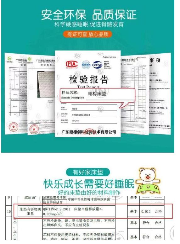 有好家床垫严格按照《中国人民共和国轻工行业标准(软体家具 弹簧软床垫)》执行,延续着丹麦YOHOKA一贯精益求精的品质。对于消费者最关注的甲醛问题,丝毫不敢怠慢,按照行业要求出具《检验报告》,甲醛释放量远低于国家标准,属于行业内优秀水准。