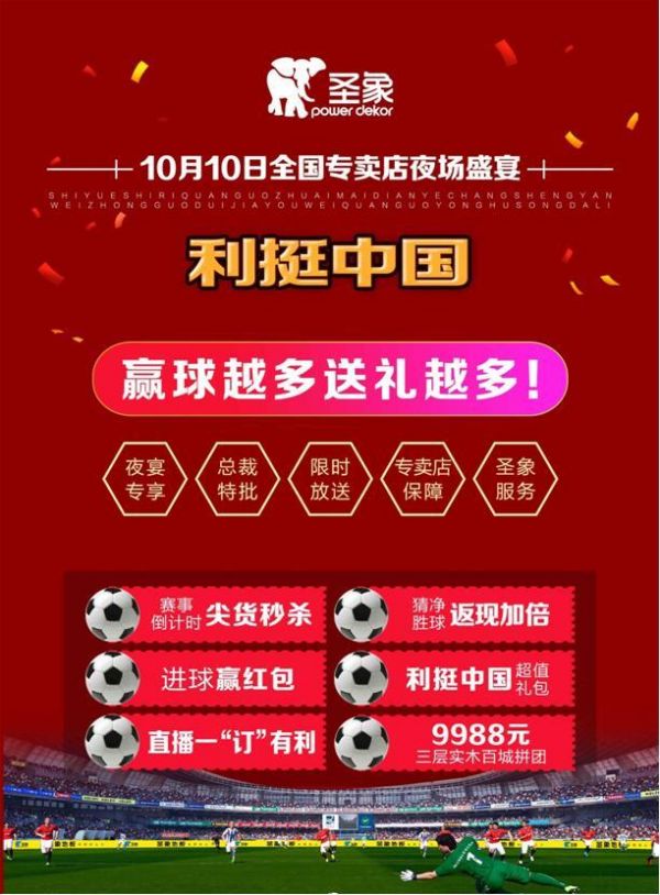 国足大获全胜的消息瞬间振奋了球迷的心,一时间,从现场到微博、微信等各大线上社交媒体平台,欢呼、祝贺声不绝于耳。作为本次比赛家居行业唯一的赛事赞助商圣象,也与国足共享着胜利的荣光。本场比赛中,圣象不仅组织了来自总部、工厂、研发中心、销售公司、经销商、售后服务代表、客户等二百人球迷助威团现场助阵,还针对比赛创新地推出了一场“利挺中国”的营销活动,即在比赛直播的同时,让利消费者,中国队赢球越多,圣象送“利”越多;赛场上国足运动员们的脚步不停,圣象的给“利”就不会止歇。