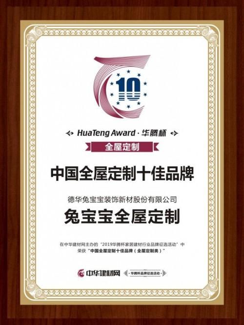 兔宝宝全屋定制荣获2019中国全屋定制十佳品牌