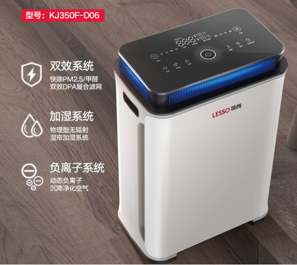 此外,考虑到不同季节空气湿度及舒适度的问题,领尚空气净化器D06配置了负离子净化功能以及加湿系统。它可通过释放纳米级负氧离子,沉降室内的污染物,让家中空气更纯净清新。而物理型无辐射湿帘加湿系统则拥有3L大容量水箱设计,加湿面积可达300ml每小时,在净化空气的同时,还可自动调节家中空气湿度,改善空气舒适度的功能。