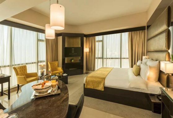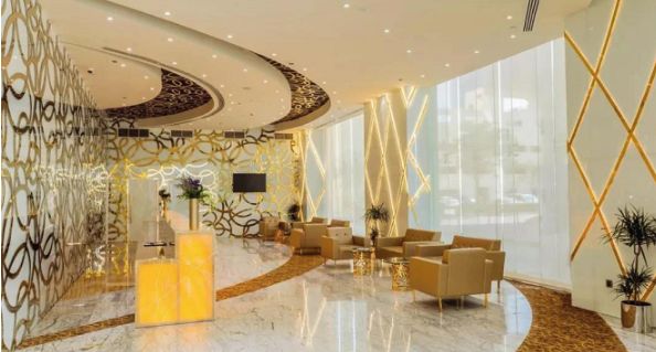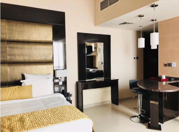 这幢有着71层高的酒店大楼设有528间客房,并配置有四家餐厅、露天泳池、豪华水疗中心、健身俱乐部、按摩浴缸等等。高耸着的金色建筑在迪拜的摩天世界中闪闪发光,十分抢眼。
