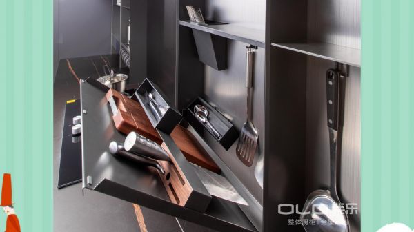 对于中柜模块的细节设计,也是符合中国家庭厨房生活的动线与习惯。比如独特设计的下翻刀叉中柜,它标配3个挂钩、1个砧板储放区、1个刀具储放架、2个刀叉盒和1个筷笼,将柜内空间合理分配,功能齐全。筷笼和刀叉盒自带气孔,中柜底部采用镂空和斜面的设计,便于空气循环,避免物品霉变风险,胡桃木刀架内含磁铁,使刀具储放更加安全卫生。当无需使用这些工具时,只要将门板轻轻一推,所有餐具即刻隐形,彻底杜绝油烟和灰尘的烦恼。