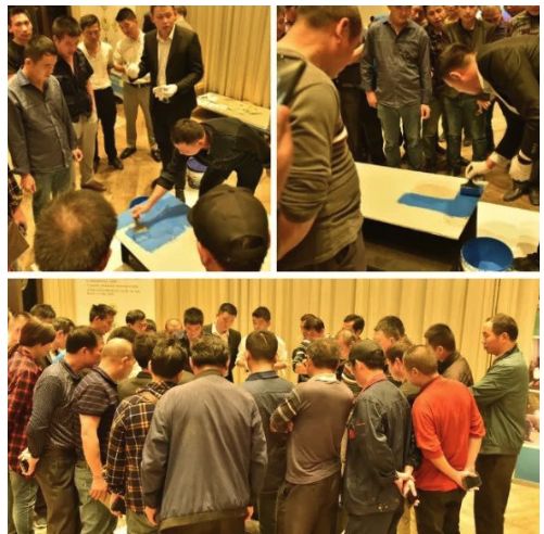 宴会期间,合肥市场部人员就产品知识、瓦工体系建设以及朗凯奇标准化施工技术进行了详细讲解,并组织师傅们现场试刷新产品。
