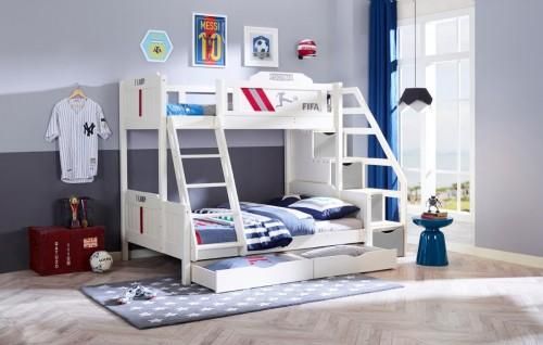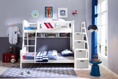 FIFA足球小将双层床:产品以白色为主色调,配以多样的足球运动元素,巧妙的将运动理念根植在家居环境中,潜移默化感染着孩子们,体验运动带来的快乐。
