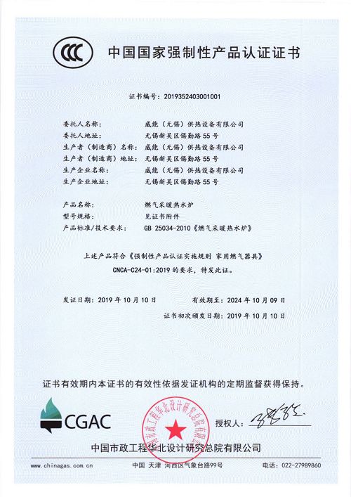 2019年10月10日,德国威能获得由中国市政工程华北设计研究总院颁发的首批燃气采暖热水炉国家强制性产品认证(CCC)证书,同时也是国内首家获得此认证的外资燃气采暖热水炉生产企业。