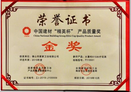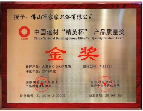 浪鲸卫浴大瀑布X10水疗花洒荣获国家陶瓷及水暖卫浴产品质量监督检验中心联合全国建筑材料工业陶瓷专业情报信息网颁发的“精英杯质量金奖”。评选活动聚焦五金产品的耐用性能、安全性能、节水性能,通过国家权威检测机构专业评测,科学客观地评估国内相关专业领域的产品质量状况。浪鲸大瀑布X10水疗花洒作为“精英杯质量金奖”获奖产品,树立了我国建筑卫生陶瓷行业质量标杆形象,为消费者选购产品提供质量指南。