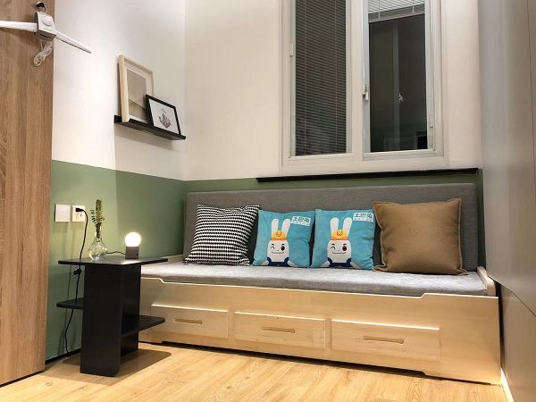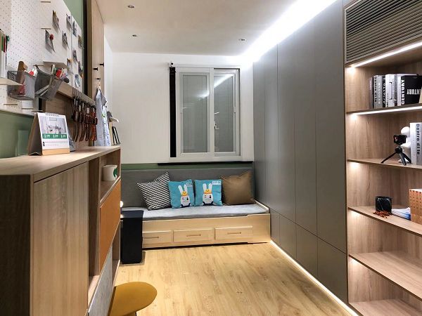 本次的设计师经过全面思考,还特意登陆了几乎是家装设计师都推崇的土巴兔设计本做了非常多的优秀设计参考以后,开启了这项充满爱的改造计划。据设计师回忆:初次到这次改造的项目现场,整个房间是被当成了储藏室使用,放置清洁工具及储备的物品。里面东西放置杂乱,空间使用不当,2个人进去就已经没有多余的空间转身。还有之前装饰时候做了全屋的胡桃木护墙板,颜色比较深。在堆满了杂物的空间局部地面因为得不到好的通风,墙面有发霉的现象。对此,改造计划显然刻不容缓。针对张班长提出的几个改造需求点,设计师通过他的奇思妙想,逐一解决原本的痛点。将原来狭隘的空间布局重新分布,把比较长的空间分了三块区域,多功能的区域、阅读储藏区,还有就是可以变化的卡座休息区。