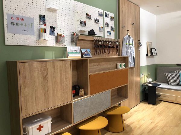 原本狭隘的空间,设计师将每个空间都做了最大化的利用。区域的上方增加了金属洞洞板可以做为工友们的互动墙和一些爱心提醒,天气情况,及交接班的留言,更方便大家互动沟通。区域下方设置了多功能的柜子,有隐藏充电手表充电器的手表放置区,茶叶茶杯的放置区,还有医药箱,提供基本的医护处理一些伤口的药品,是一处非常贴心的设计。柜子的门板采用软包布艺 平时关上门就是一个站立时候和做在下方的方凳的时候的软包靠背。还有一组柜门是可以翻下来作为一个临时写字台和书桌使用。 柜子最下面是设计了悬空处理,平时人少的时候就把方凳藏在吊柜的下方。不影响人员走动的路线。同时在悬空处我们还预留了电源,放置了鞋子烘干器以便环卫工人们可以在雨雪天气工作把湿的鞋子做烘干处理。